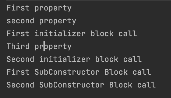 Sub constructor block은 가장 나중에 실행되며, 위임한 순서대로 호출된다.