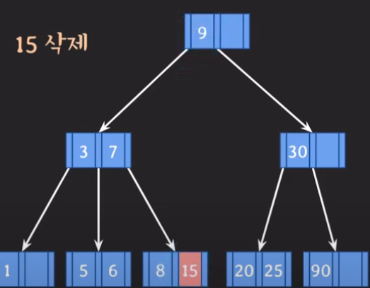 형제노드에서 데이터를 가져올수도 없는 상황이라, 부모로 부터 중간값을 내려받고, 두 노드를 왼쪽으로 병합한다.