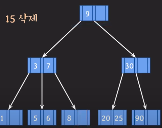 삭제이 불만족이 발생하였고, 형제노드에서 데이터를 가져올수도 없는 상황이라, 부모로 부터 중간값을 내려받고,