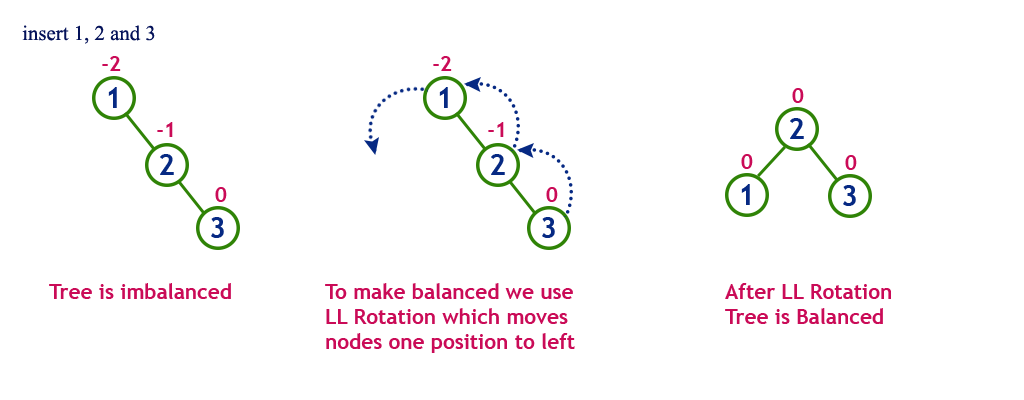 중간 노드(2)를 기준으로 왼쪽 방향으로 트리를 회전시킨다,