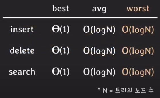 검색, 삽입, 삭제는 모두 평균과 최악의 경우 O(log n)의 시간복잡도가 걸린다.