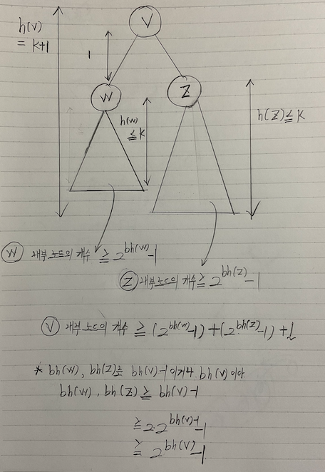 v의 서브 트리의 internel 노드의 개수 >= 2^bh(v) - 1
