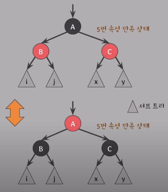 -> 두 자식이 모두 같은 색의 노드라면, 부모와 색을 바꿔주어도 5번 조건은 성립한다.