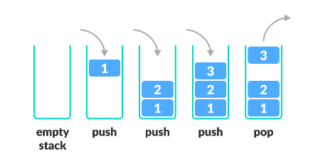 자료를 넣는 것을 '밀어넣는다' 하여 푸쉬(push)라고 하고 반대로 넣어둔 자료를 꺼내는 것을 팝(pop)이라고 하는데, 이때 꺼내지는 자료는 가장 최근에 푸쉬한 자료부터 나오게 된다. 이처럼 나중에 넣은 값이 먼저 나오는 것을 LIFO 구조라고 한다.