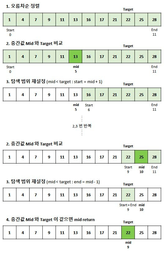 오름차순으로 정렬된 리스트에서 특정한 값의 위치를 찾는 알고리즘이다.