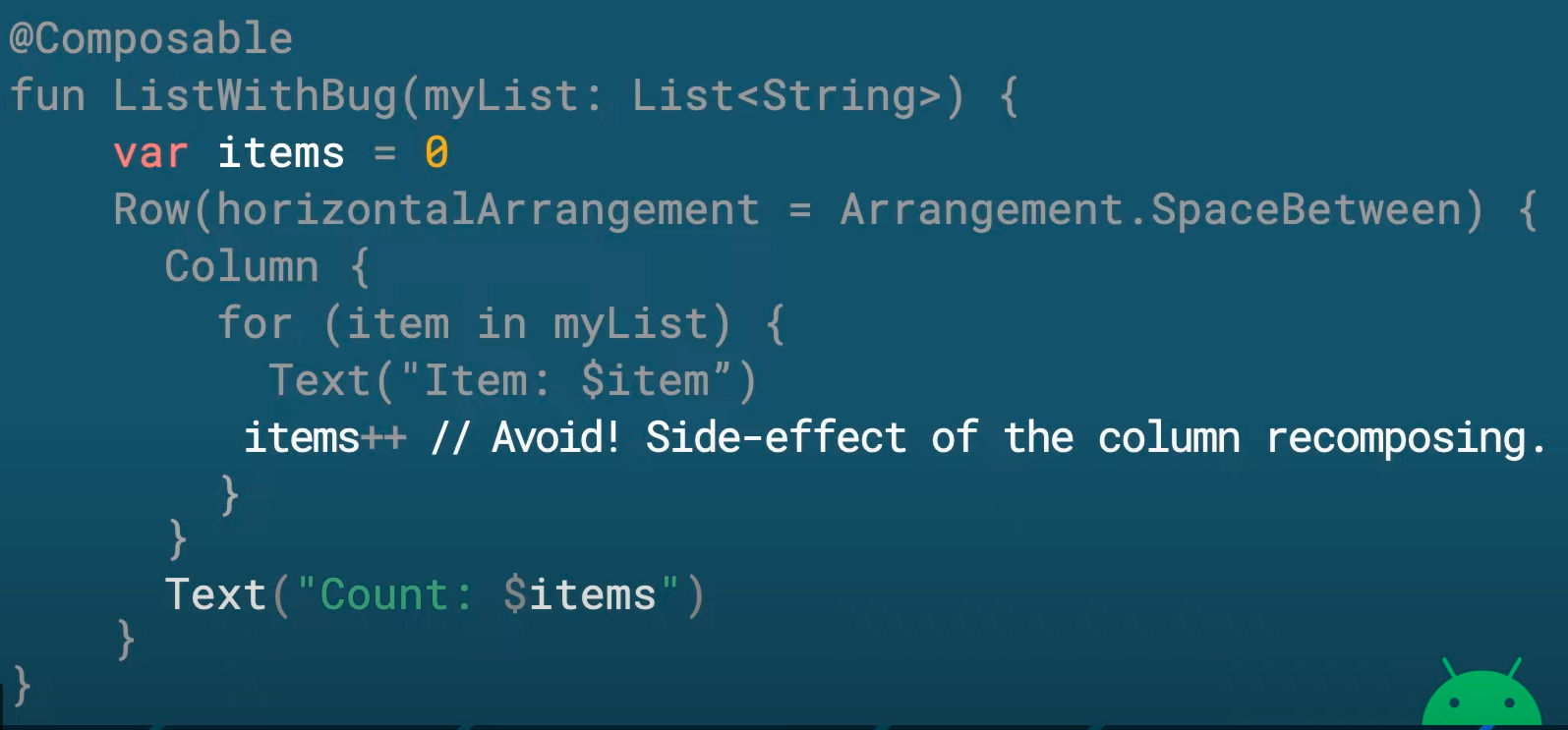 즉, composable 람다에서 변수를 수정하는 코드는 피해야 합니다. 이러한 코드는 스레드로부터 안전하지 않을 뿐만 아니라 composable 람다의 허용되지 않는 부작용이기 때문입니다.