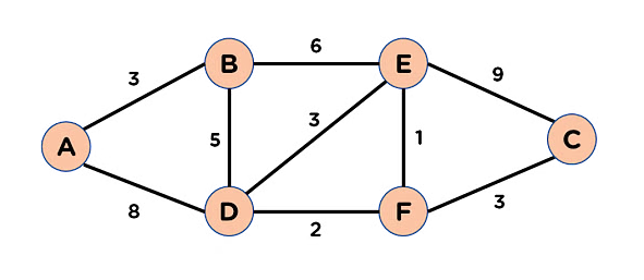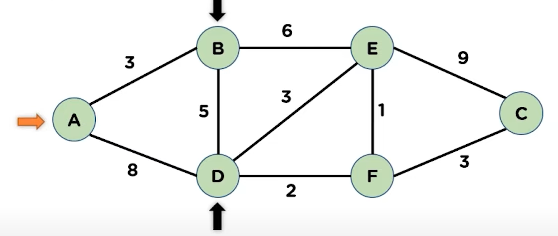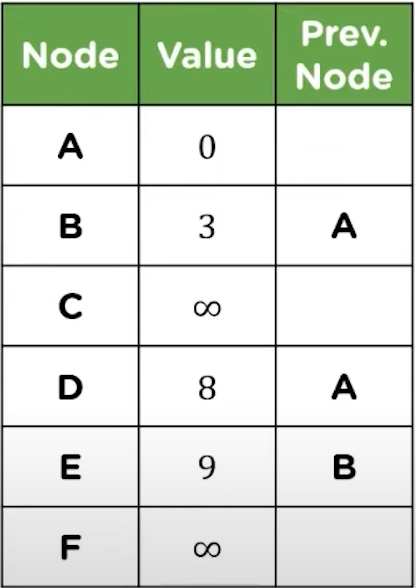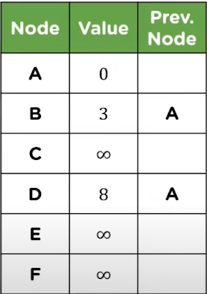 출발점 A로 시작한다 가정하면, 갈수 있는곳은 B, D 두 군데이며,테이블을 갱신 후, 시작점(A)에서 가까운 B로 간다.