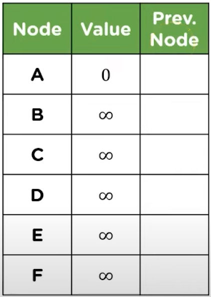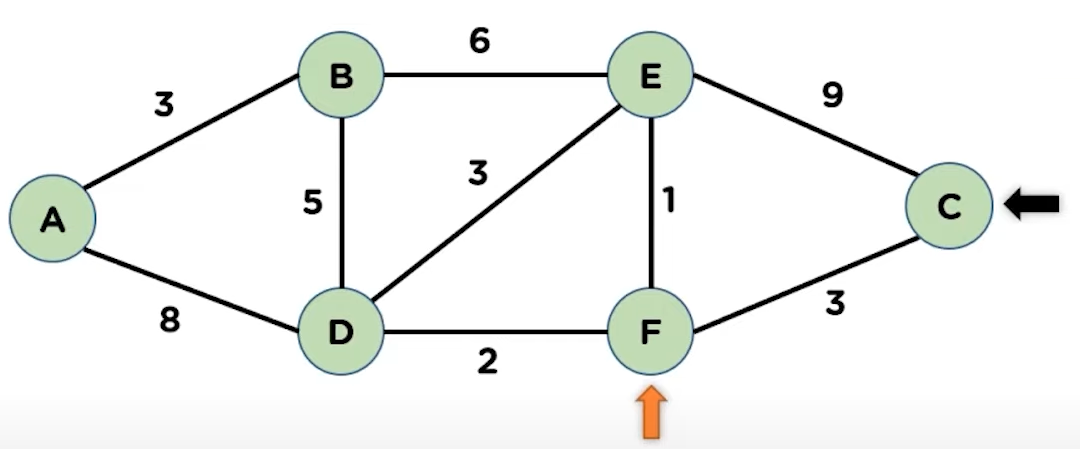 F로 이동후, 갈수 있는곳은 D F 두 곳이며, (단 B,D는 재방문하면 안됨) 테이블을 갱신 후, 시작점(A)에서 가까운 C로 간다.