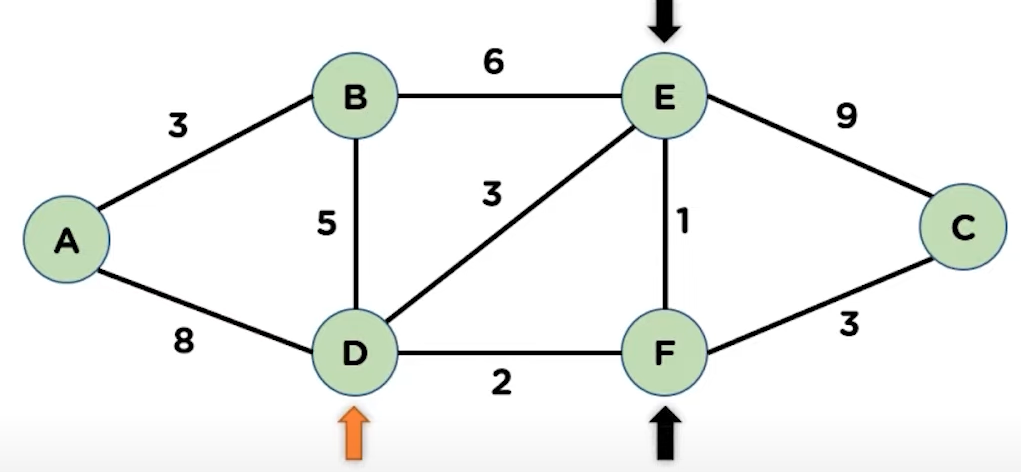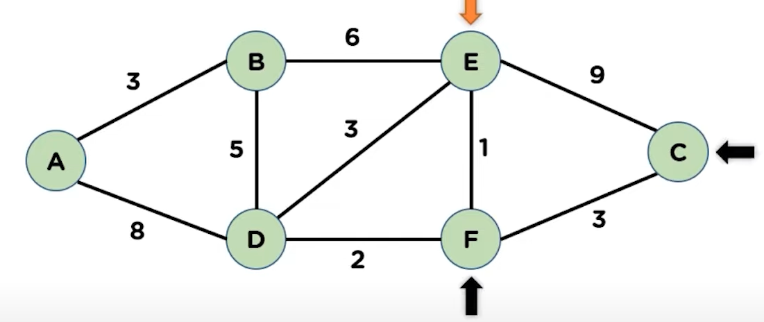 E로 이동후, 갈수 있는곳은 D F 두 곳이며, (단 B,D는 재방문하면 안됨) 테이블을 갱신 후, 시작점(A)에서 가까운 F로 간다.