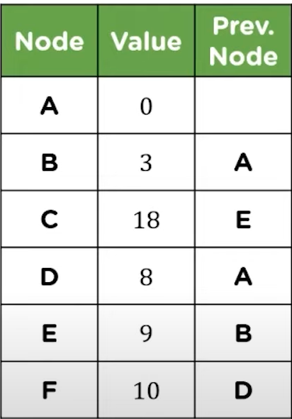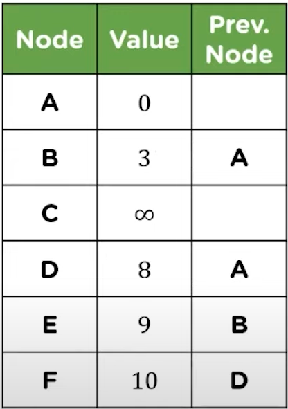 D로 이동후, 갈수 있는곳은 E, F 세 군데이며, (단 B는 재방문하면 안됨) 테이블을 갱신 후, 시작점(A)에서 가까운 E로 간다.