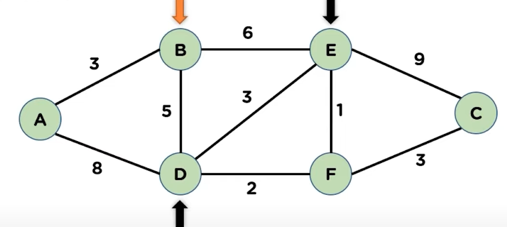 B로 이동후, 갈수 있는곳은 E, D 두 군데이며, 테이블을 갱신 후, 시작점(A)에서 가까운 D로 간다.