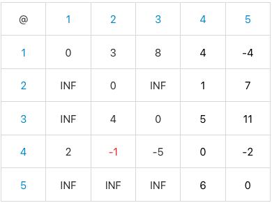 4번 --> 5번 이동 불가능(INF) 했지만, 1을 경우하면, 4 --> 1 --> 5 값 -2로 갱신
