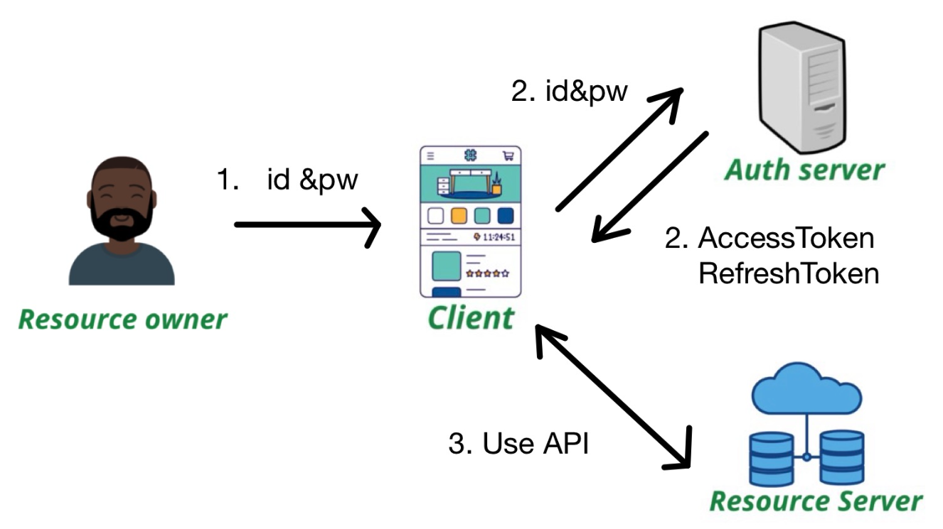 Resource Owner(사용자)의 ID 및 Password를 Client에게 전달하고 Client는 사용자의 ID/Password를 통해서 Authorization Server로 부터 AccessToken/RefreshToken을 받아서 Resource Server API 이용합니다.
