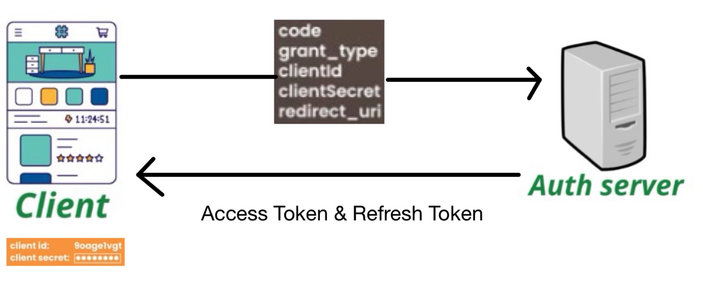Client는 Authorization Code, ClientId, ClientSecret 등의 정보를 넣어 AuthServer에게 Resource Server API 이용을 위한 AccessToken & RefreshToken을 발급받는다.