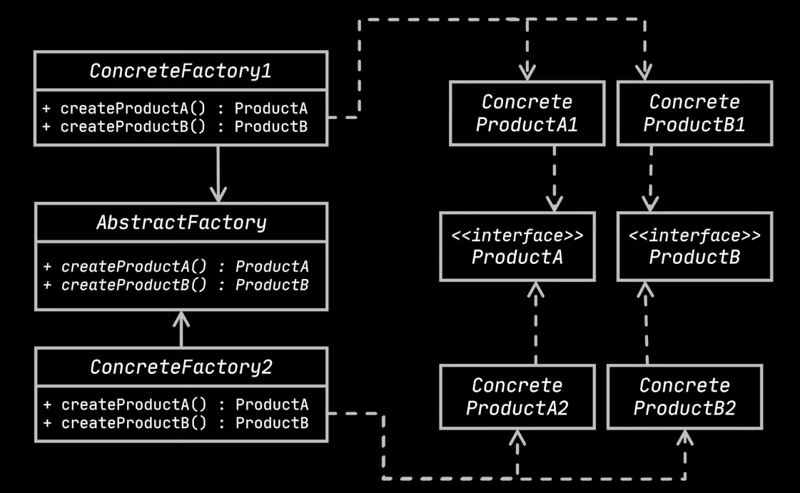 Abstract Factory Pattern(추상 팩토리 패턴)은 객체의 패밀리(제품군) 실제 구현의 세부 사항을 일반 인터페이스를 사용하여 분리하고 object composition(인터페이스 구현)을 사용합니다. 객체 생성은 팩토리 인터페이스에 공개된 메서드를 통해서만 가능합니다.
