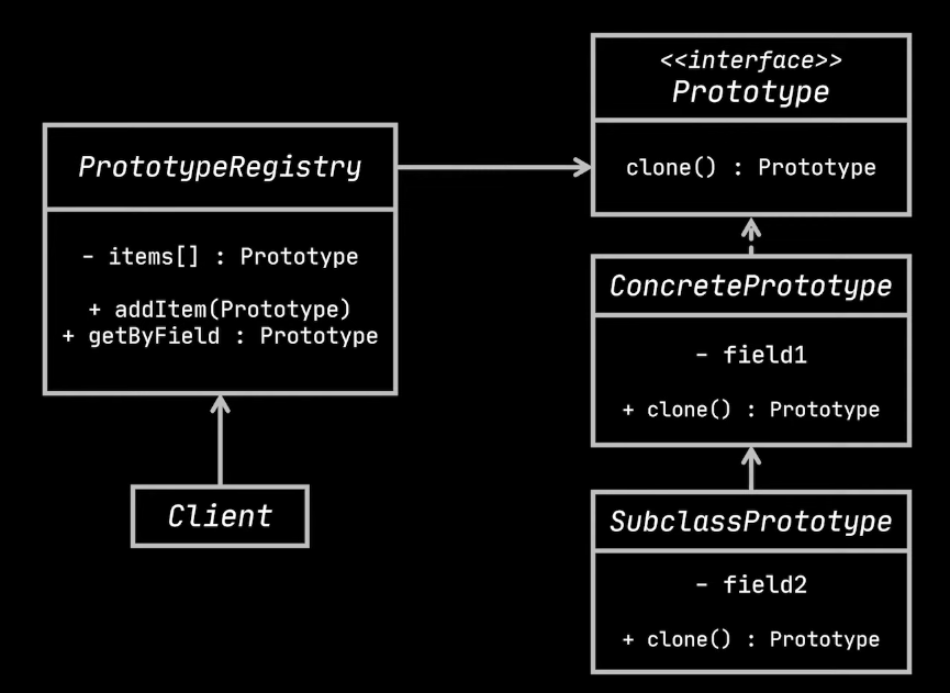 생성할 객체들의 타입이 prototype(프로토타입)인 인스턴스로부터 결정되도록 하며, 인스턴스는 새 객체를 만들기 위해 자신을 복제(clone)하게 한다. 즉, 객체로 부터 객체를 생성해야 될 경우 사용하면 좋다. 복제하려는 객체의 concrete class에 의존하지 않아도 된다.
