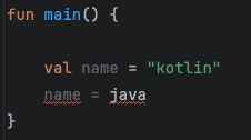 => 코틀린에서 변수 및 객체의 속성에 val 의 키워드가 붙어 있다면, 초기화시 대입된 값은 절대 변하지 않는다.