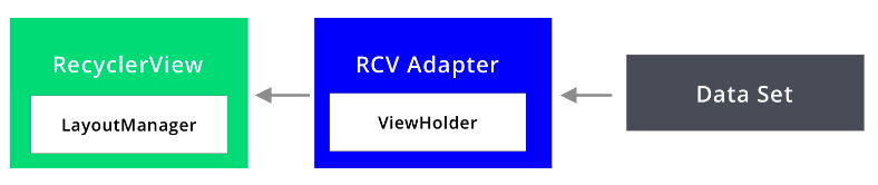- LayoutManager를 변경하면 RecyclerView를 사용하여 표준 수직 스크롤 목록, 균일한 그리드, 계단형 그리드, 수평 스크롤 컬렉션 등을 구현할 수 있습니다.