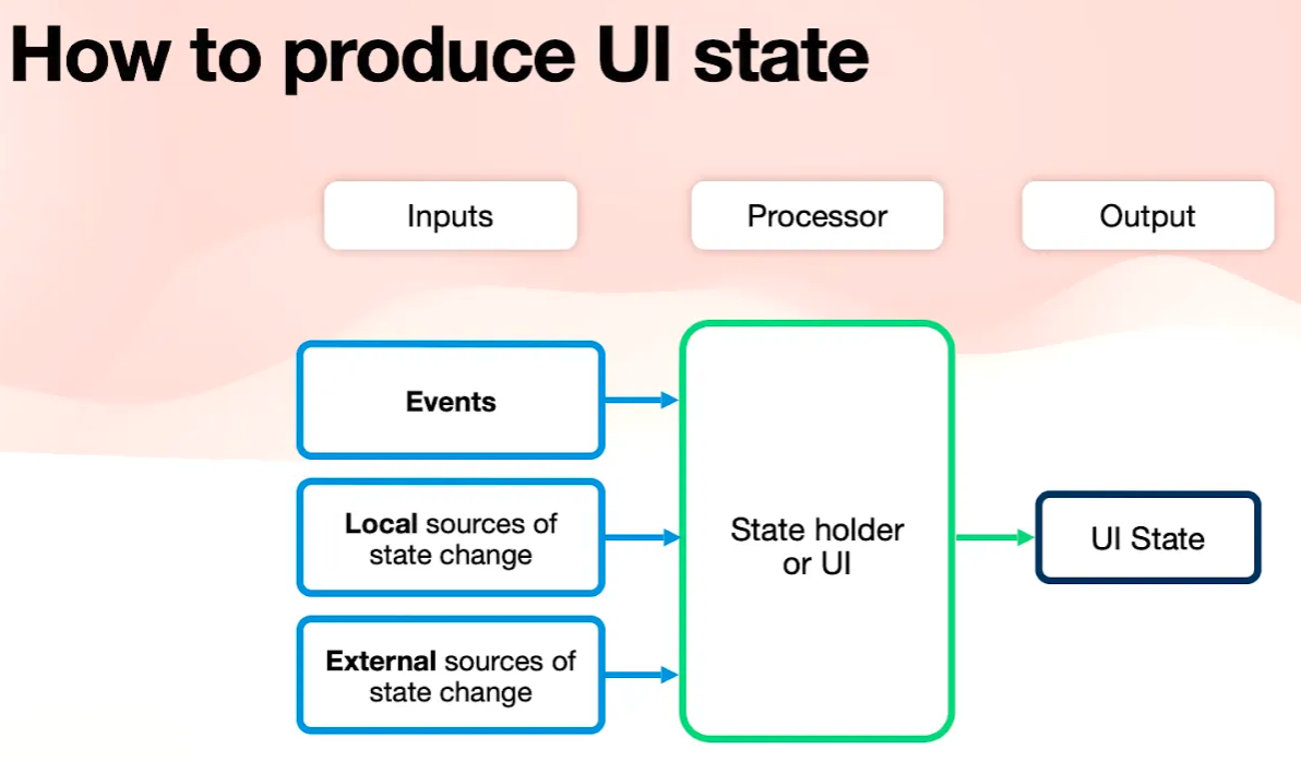 UI 상태를 생성하는 비즈니스 로직은 상태 홀더에 Local합니다. UI 상태를 직접 수정하고 단일 진실 소스 원칙을 위반하는 관찰 가능한 상태 홀더의 변경 가능한 버전을 노출하는 것을 방지하기 위해 UI 상태를 StateFlow로 노출합니다.