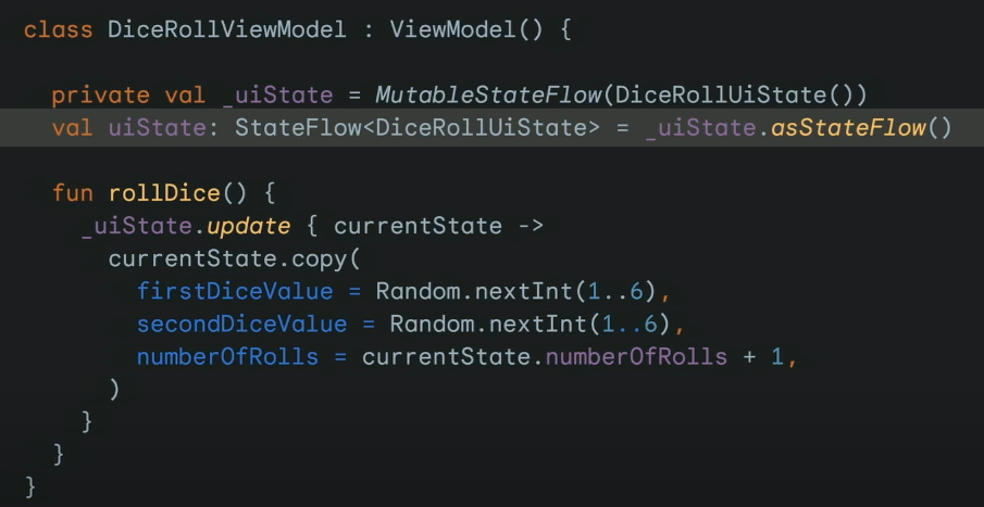 MutableStateFlow API를 사용하여 이를 달성합니다. 재사용성과 테스트 가능성에 영향을 미칠 수 있는 Random API에 대한 직접적인 종속성을 피하기 위해 Random API를 구현하는 보다 일반적인 RandomProvider 인터페이스를 도입합니다.