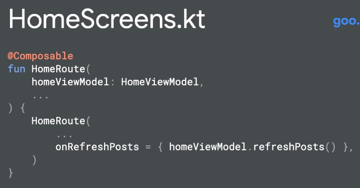 사용자의 행동(새로고침 버튼 누름)으로 UI(화면의 리스트) 갱신하는것은 Business logic에 해당하기 때문에 ViewModel에 위임하여 처리합니다.