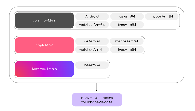 jvm, iosArm64, js target을 사용하는 예를 생각해 보겠습니다. Kotlin은 공통 코드에 대한 commonMain source sets를 생성하고, 특정 target에 대한 해당 jvmMain, iosArm64Main, jsMain source sets를 생성합니다.