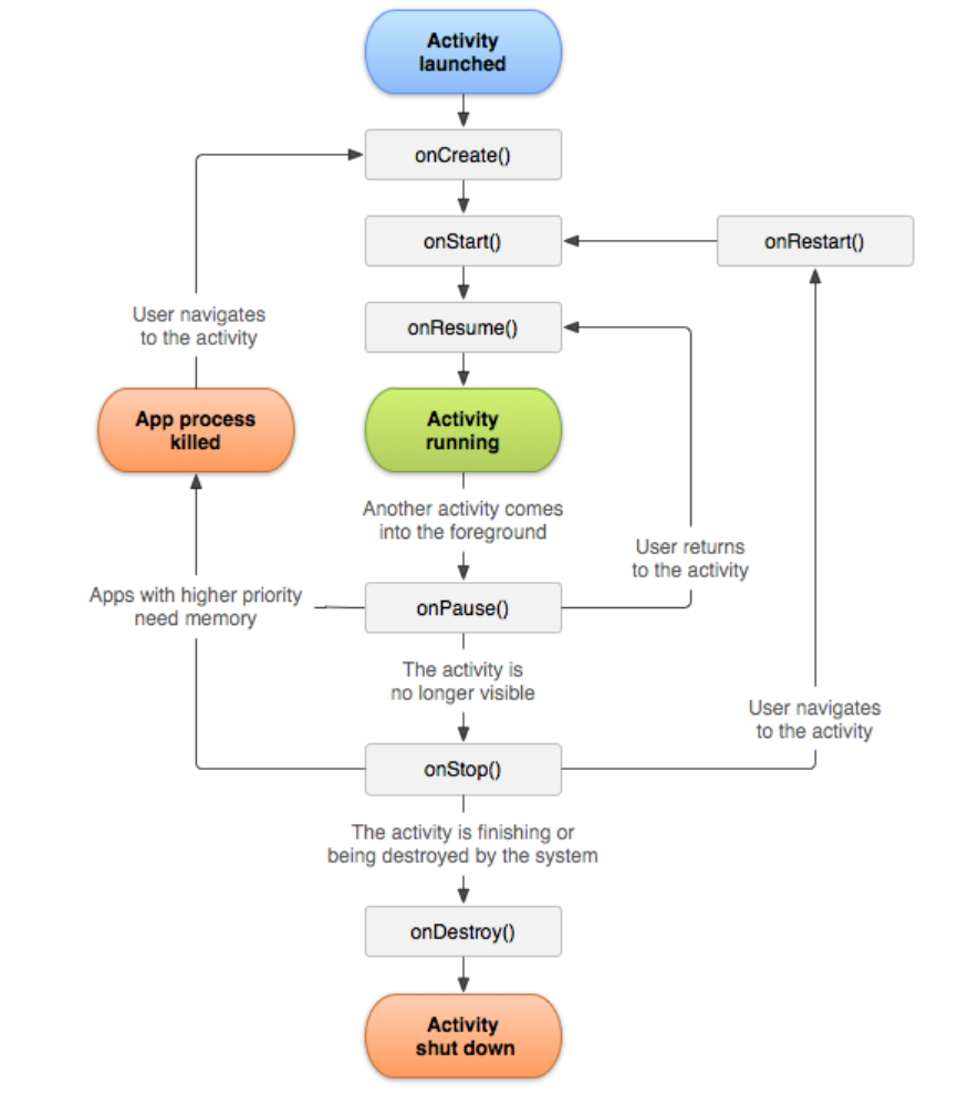- onCreate()가 종료되면 Activity 'OnStart()' 상태로 전환되고 Activity가 사용자에게 보이기 시작.