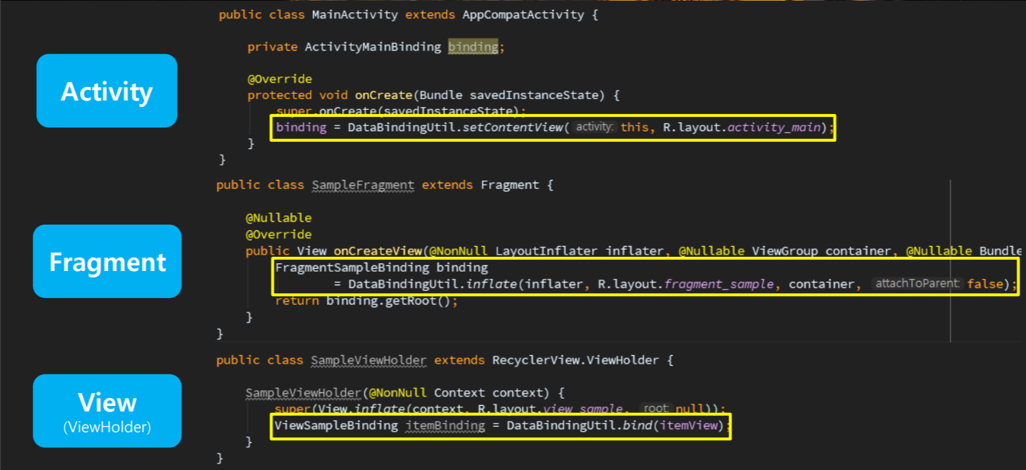 바인딩 클래스는 내부에서 각 뷰 객체 를 미리 findViewById()를 호출한 결과를 캐싱해두기 때문에 Activity 또는 Fragment와 같은 UI 기반 클래스에서 View에 접근할 수 있다.