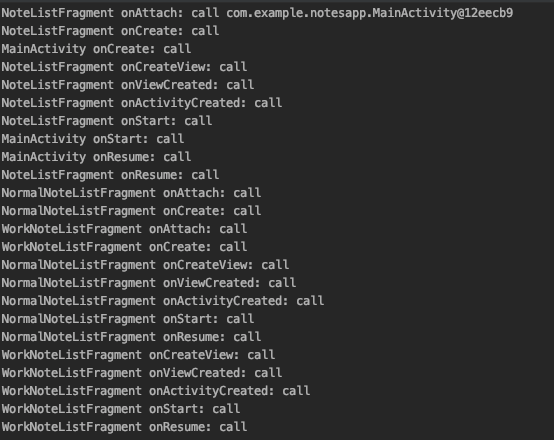 일반적인 NoteFragment가 활성상태(onResume) 이후 페이지(Fragment) 생명주기가 순차적으로 실행된다