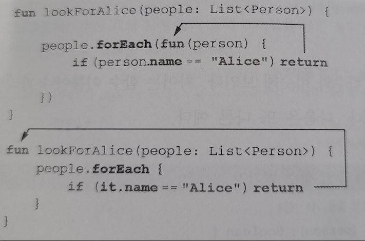 이렇게 return이 바깥쪽 함수를 반환시킬 수 있는 때는 람다를 인자로 받는 함수가 인라인 함수인 경우 뿐이다.