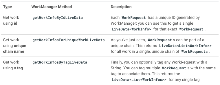 WorkManager.getWorkInfosByTag(String) - 현재 작업 상태를 확인하는 데 사용할 수 있는 WorkInfo 객체 목록을 반환