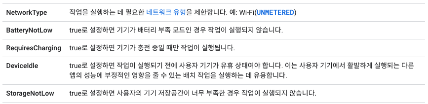 Contraints.Builder()를 사용하여 Constraints ---> WorkRequest.Builder()